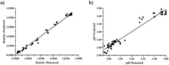Predicted vs. measured values for the best prediction models of (a) density (expressed in grams per millilitre) and (b) pH. Both models were calculated using spectra obtained from measurements without stirring.