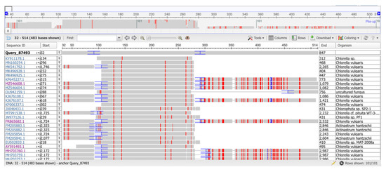 Multiple sequence alignment (MSA) of the BlastN result using the rRNA amplicon sequence. The consensus of the Oxford Nanopore sequencing was used for the BlastN analysis. The MSA shows the first 25 hits, among which most are Chlorella vulgaris sequences.