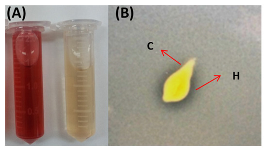 Qualitative tests to evaluate the production of exogenous IAA (A) and phosphorus solubilization (B) by a strain of C. vulgaris isolated from soil. In (A), the tube on the left shows the reaction with the microalga compared to the tube on the right (negative control). In (B), ‘C’ indicates the colony, and ‘H’ indicates the solubilization halo in the medium with insoluble phosphate.