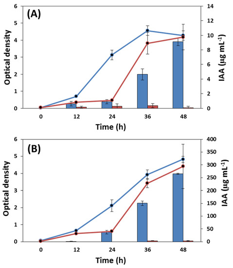 Cell growth was evaluated by analyzing the optical density (absorbance) at 600 nm. Then, the cell suspension was centrifuged, and 0.5 mL of the supernatant was added to 0.5 mL of Salkowski reagent. The intensity of the color generated during the reaction was determined by spectrophotometry at 530 nm, and the concentration of IAA was estimated from a standard curve.