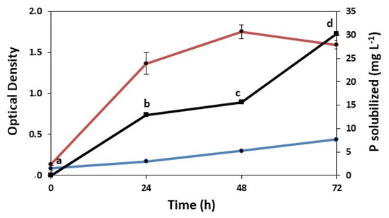 Growth of C. vulgaris in NBRIP medium without insoluble phosphate (blue line) and with insoluble phosphate (red line), along with phosphorus solubilization (black line). Different letters on the black line indicate significant difference determined by Tukey’s test at each time period (p < 0.05).
