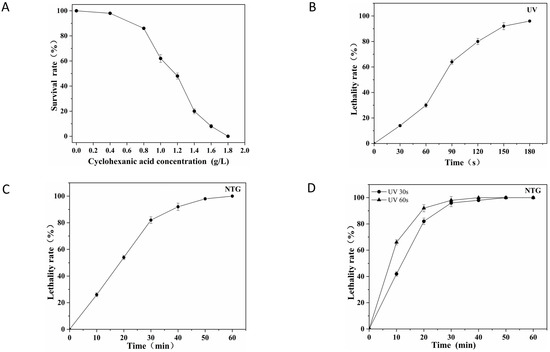 Assessment of CHC tolerance and the effect of mutagenic conditions on the viability of S. avermitilis N72. (A) The survival rate of S. avermitilis N72 at different concentrations of CHC, (B) lethality of S. avermitilis N72 by UV, (C) lethality of S. avermitilis N72 by NTG, (D) lethality of S. avermitilis N72 by the combined effect of UV and NTG.