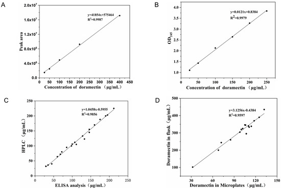 Analysis of the correlation between doramectin ELISA assay and HPLC quantification. (A) doramectin HPLC standard curve, (B) doramectin ELISA standard curve, (C) correlation of HPLC assay with ELISA method, (D) correlation of single-colony microplate surface culture with shake flask fermentation.