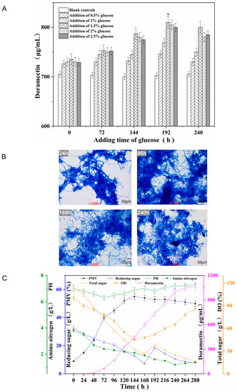 Based on the metabolic characteristics of XY-62 fermentation, sugar consumption was enhanced, and the amount of reducing sugars was low in the late stage, so glucose was supplemented. The supplementation of glucose promoted the accumulation of doramectin (Figure 5A), especially at the 192nd hour of fermentation when supplemented with 1.5% glucose. The doramectin yield reached 810 μg/mL, which was 14.8% and 10.2% higher than that of the control group without glucose supplementation and with 1.5% glucose added to the base medium, respectively.