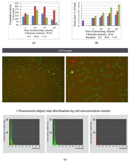 Yeast fermentation activity (a) and non-viable cell count (b) during ultrasound treatment; non-viable cell count (c) at 15 W/m2 and a contact time of 20 min (LUNA-II YF™ research protocol) (green - live cells, red - dead cells). In panels (a,b), the values with a statistically significant difference ≤0.05 are shown.