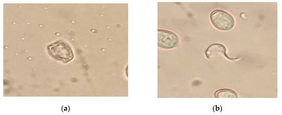 The results of ultrasound treatment on the fermentation activity and the non-viable cell count of the yeast samples are illustrated in Figure 2. The fermentation activity grew during the first 15 min of ultrasonic treatment, regardless of its intensity. After that, the value of this indicator started to decrease (Figure 2a). A more powerful ultrasound treatment also increased the fermentation. However, the fermentation was 16% less active at 15 W/m2 than at 10 W/m2, although the contact time remained the same (10 min). The fermentation activity reached its peak after 10–15 min of ultrasonic treatment at 10–15 W/m2. It exceeded the initial value by 94–98%. The non-viable cell count (Figure 2b) increased by 1.5–4.2 times compared with the control, following the increase in the time and volume of ultrasonic exposure. A significant increase in the population of nonviable cells occurred at 15 W/m2 and a contact time of ≥10 min (Figure 2c). This phenomenon resulted from the cell destruction caused by cavitation centers that appeared during the ultrasonic treatment (Figure 3). The obtained results were consistent with those published in [40,45,49,60,61]. Kaluzhina et al. [49] treated Safale T-58 brewer’s yeast with ultrasound at an oscillation frequency of 44 kHz for 5 min. The treatment increased the fermentation activity by 36% and contributed to the maximal increase in biomass, budding cells, and glycogen. However, a longer ultrasound exposure led to excessive cell death. Del Fresno et al. [45] observed the effects of lysis of wine yeast cells after 20 min of ultrasound treatment at 24 kHz and 52 W/cm2. They observed cell death at a sound frequency of 20 kHz after 30 min [61].
