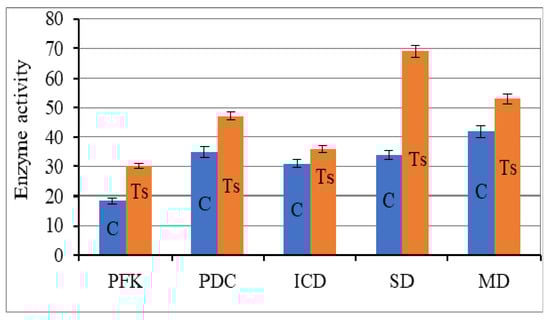 Effect of yeast treatment with ultrasound and a mix of Krebs cycle acids on the activity of enzymes: PFK: 6-phosphofructokinase (µmol fructose-6-phosphate/g DM·min·10−2); PDC: pyruvate dehydrogenase complex; ICD: isocitrate dehydrogenase; SD: succinate dehydrogenase; MD: malate dehydrogenase (PDC, ICD, SD, MD–µmol NADH/g DM·min); C: control; Ts: test sample. The figure illustrates the values with a statistically significant difference ≤0.05.