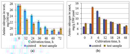 Amino acid nitrogen in culture medium (a) and in yeast (b) in the activated microbial culture. In panels (a) and (b), the values with a statistically significant difference ≤0.05 are shown.