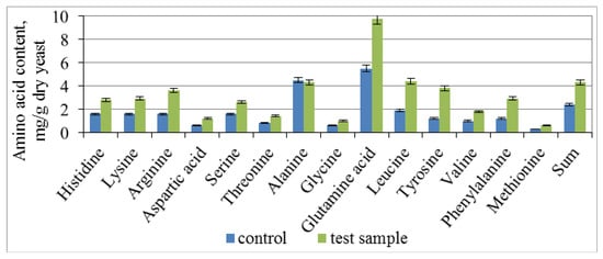 The amount of new amine nitrogen in yeast cells was, on average, 1.3 times greater than that consumed from the medium. Such an increase happened because of the stimulation of amino acid synthesis. Probably, most amino acids appeared at the expense of endogenous resources of the yeast cell, i.e., the so-called amino acid pool [24,25]. The amino acid composition of yeast in the test and control samples at the onset of the exponential phase revealed a change in the quantitative content, but no qualitative transformation (Figure 6). The total concentration of free amino acids was 1.8 times higher in the test sample than in the control. The following amino acids predominated in the cell biomass in both the test samples and the control: tyrosine (7% of the total), leucine (9%), alanine (14%) and glutamic acid (23%).