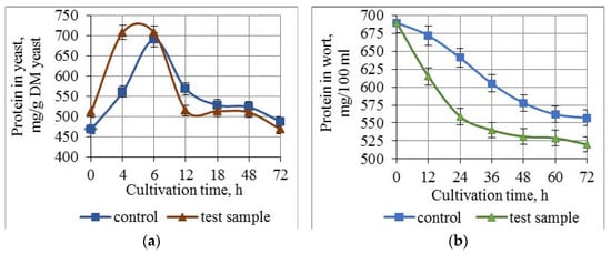 An extra amount of digestible nitrogenous compounds had a positive effect on the metabolic processes of the yeast cell, particularly on protein synthesis. Figure 7a demonstrates the intracellular protein in yeast, while Figure 7b illustrates the protein in the culture medium.