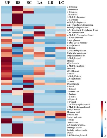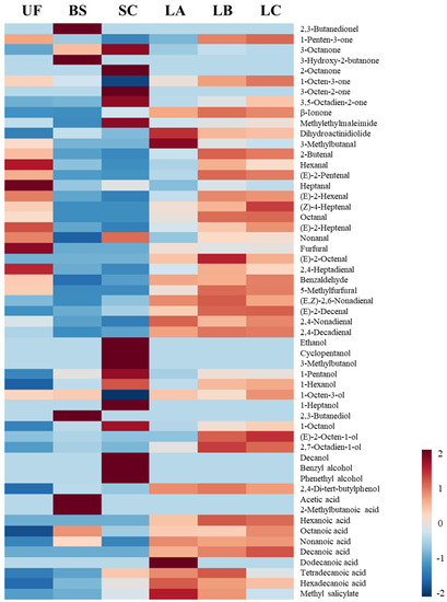 Heat map of the volatile compounds in the brown seaweed Laminaria sp. fermented by various microorganisms. Colors indicate the Z-score distances to the mean levels of the observations. A Z-score greater than 1.645 (red color) or lower than −1.645 (blue color) is significant at the 0.05 level. UF: unfermented; BS: B. subtilis; SC: S. cerevisiae; LA: Lb. acidophilus; LB: Lb. delbrueckii subsp. bulgaricus; LC: Lb. casei.