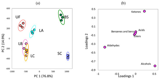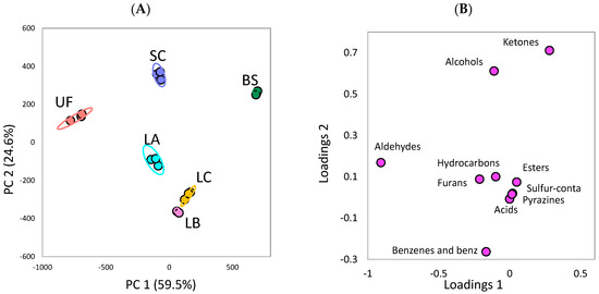 Principal component analysis plots of chemical groups of the volatile compounds in the green seaweed Ulva sp. fermented by various microorganisms: (A) score plot (B) loading plot. UF: unfermented; BS: B. subtilis; SC: S. cerevisiae; LA: Lb. acidophilus; LB: Lb. delbrueckii subsp. bulgaricus; LC: Lb. casei. Sulfur-conta, sulfur containing compounds; benz, benzene derivatives.
