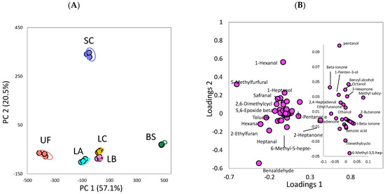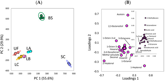 Principal component analysis plots of the volatile compounds in the brown seaweed Laminaria sp. fermented by various microorganisms: (A) score plot (B) loading plot. UF: unfermented; BS: B. subtilis; SC: S. cerevisiae; LA: Lb. acidophilus; LB: Lb. delbrueckii subsp. bulgaricus; LC: Lb. casei.