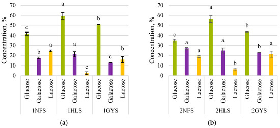 Sugars’ concentrations during 4 h of lactose hydrolysis. (a)—sweet whey permeate 1GYS—GODO-YNL2; 1NFS—NOLA™ Fit5500; 1HLS—Ha-Lactase 5200. (b)—acid whey permeate 2GYA—GODO-YNL2; 2NFA—NOLA™ Fit5500; 2HLA—Ha-Lactase 5200. The values marked with the same letter within each sugar do not differ significantly (p > 0.05).