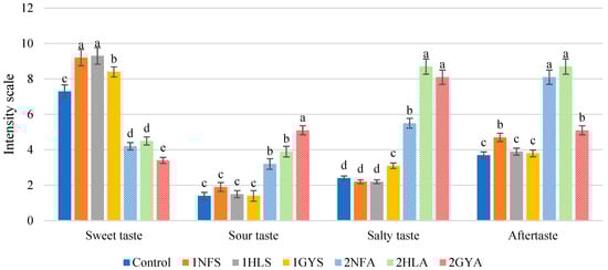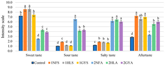 Selected taste attributes of samples obtained in the first-stage fermentation were determined using sensory studies and are shown in Figure 2.