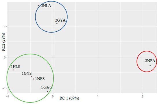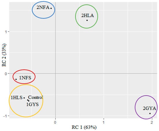 Principal component analysis (PCA) generated from the sensory properties of hydrolysed whey permeates after first-stage fermentation. Using sweet whey permeate and enzyme 1GYS—GODO-YNL2; 1NFS—NOLA™ Fit5500; 1HLS—Ha-Lactase 5200. Using acid whey permeate and enzyme 2GYA—GODO-YNL2; 2NFA—NOLA™ Fit5500; 2HLA—Ha-Lactase 5200. Control—commercial glucose-galactose syrup. The values with the same letter within each column do not differ significantly (p > 0.05).