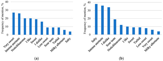 Frequency of the 11 most frequently mentioned descriptions that participants noted during evaluation. Glucose-galactose syrups of second-stage fermentation from sweet whey permeate (a); Glucose-galactose syrups of two-stage fermentation from acid whey permeate (b).