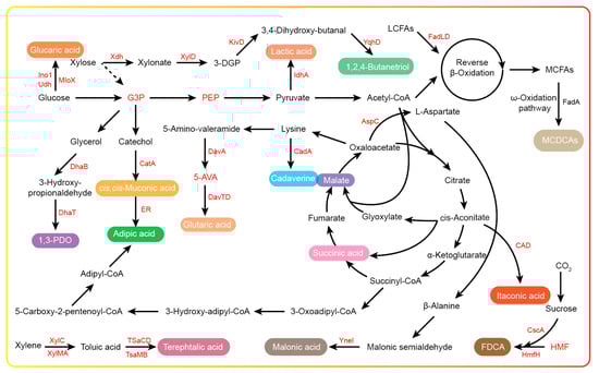 | Glutaric acid | E. coli | Introducing the malonic acid utilization pathway | 6.3 g·L−1 | [100] |