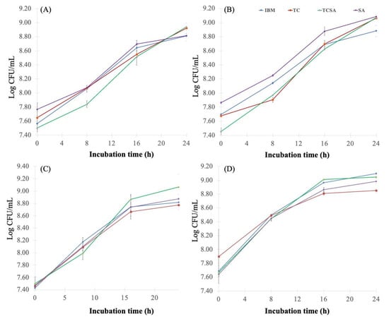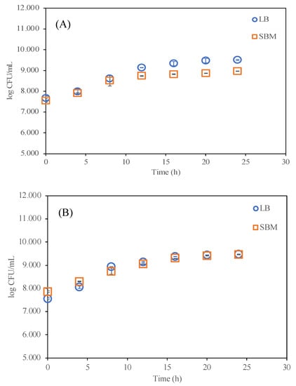 The culture medium (50 mL) was prepared in 250 mL Erlenmeyer flasks in triplicate. Each medium was inoculated with 2% (v/v) overnight seed culture and incubated at 28 °C for 24 h with 200 rpm agitation in a shaking incubator (model VS-8480SFN, Vision Scientific Co., Ltd., Daejeon, Korea). At 4 h intervals, cell growth was measured via viable plate count on LB agar supplemented with appropriate antibiotics and incubated at 28 °C for 48 h.