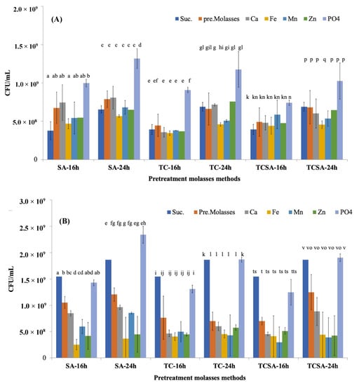 Moreover, minerals (calcium, phosphate) and heavy metals (Fe2+, Mn2+, Zn2+) were also added to the molasses-based medium to study the effects of minerals and heavy metals. Supplementation with phosphate in SA-, TC- and TCSA-molasses-based media significantly enhanced the growth of both A. tumefaciens EHA105-pEAQ and A. tumefaciens GV3101-pEAQ, which was higher than their growth in the sucrose-based defined medium. The highest cell growth was observed in A. tumefaciens GV3101-pEAQ with the SA-molasses-based medium supplemented with phosphate (Figure 2B) with a viable count of 2.34 × 109 CFU/mL at 24 h cultivation.