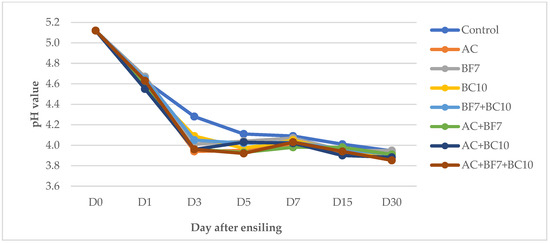 The changes in pH value of cassava root silage during 30 days of ensiling. AC—Acremonium cellulase; BF7—E. feacium KKU-BF7 inoculant; BC10—E. gallinarum KKU-BC10 inoculant.