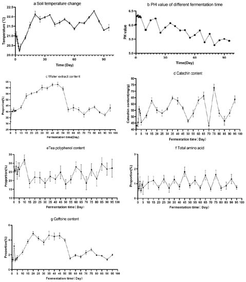 Physiochemical analysis of sour tea (a) Changes of soil temperature during fermentation (b) pH value changes during the fermentation of sour tea. Contents of the main antioxidant substances in sour tea at different fermentation times. (c) The content of water extract in sour tea fermentation. (d) The catechin content in sour tea fermentation. (e) The tea polyphenol content in sour tea fermentation. (f) The total amino acid content in sour tea fermentation. (g) The caffeine content in sour tea fermentation.