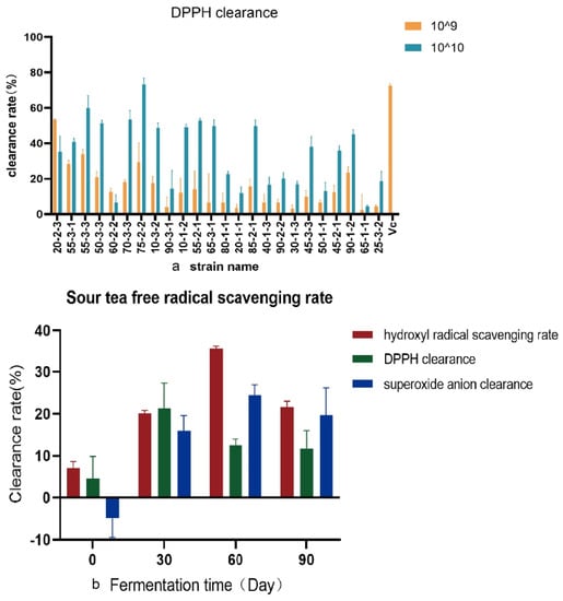 Antioxidant capacity was measured (a) DPPH free radical scavenging rate of 24 strains of Lb. plantarum isolated from sour tea. Vc (0.8 mg/mL) was the positive control. Orange represents the bacterial concentration of 109 CFU, and blue represents the bacterial concentration of 1010 CFU. (b) Free radical scavenging rate of sour tea fermented at different times.