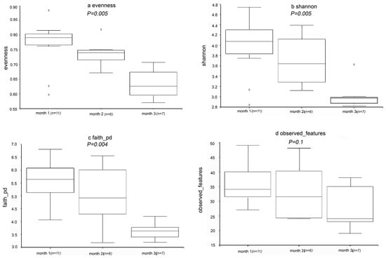 According to the sequencing results, 1596 OTUs were found in the samples. The coverage index of all samples was at least 99%, indicating that the information obtained is sufficient to reveal the existence and relative richness of most components of the bacterial community. The evenness, Shannon’s diversity, Faith’s pd, and observed features indices are represented in the form of box plots (Figure 4a–d). According to Figure 4a–c, evenness, Shannon’s diversity, and Faith’s pd index values decreased significantly during the fermentation process, indicating that microbial diversity decreased significantly. This may be related to the length of fermentation time. The microbial richness was expressed by number of OTUs. In addition, according to Figure 4d, the observed features index did not change significantly. There was no significant change in the observed features index, which may be due to the difference between the algorithm and other indexes [].