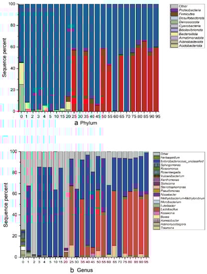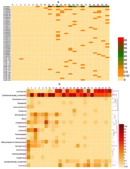 Among all samples, the OTU with the highest sequence proportion was Latilactobacillus (0–65%). After further analysis, it was determined to be the Lb. plantarum sequence. At the same time, a relatively high number of OTUs belonged to Enterobacter, which is consistent with the classification information. This OTU belonged to Pantoea septica after blast comparison, which is a bacterium often detected in plants. The changes in these OTUs during fermentation are shown in Figure 6a (those with low proportions are shown in red). From Day 25, the proportion of Lb. plantarum increased to 56%, and in most samples thereafter, the proportion remained at approximately 50%. The highest proportion of Lb. plantarum was 64% on Day 85 of fermentation. This shows that the main bacteria in the fermentation process of sour tea are Lb. plantarum and Enterobacter. The tea was pretreated before fermentation (stir-fry the tea). Although tea was pretreated before fermentation, some trace bacteria will still be retained. This may be one of the possible sources of Lb. plantarum in the fermentation process. In the 0 day sour tea samples, Roseomonas and Sphingomonas account for the highest proportion. They were very common bacteria in the environment. This was the same as most fermented tea [].