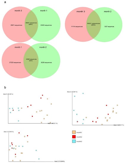 The bacterial sequences shared between the sour teas with different fermentation times are shown by the Venn diagram. Sour tea fermented for three months shared nearly 60% of the sequence with sour tea fermented for one month and two months. However, 40% of bacterial sequences were shared between one-month fermented sour tea and two-month fermented sour tea (Figure 7a).