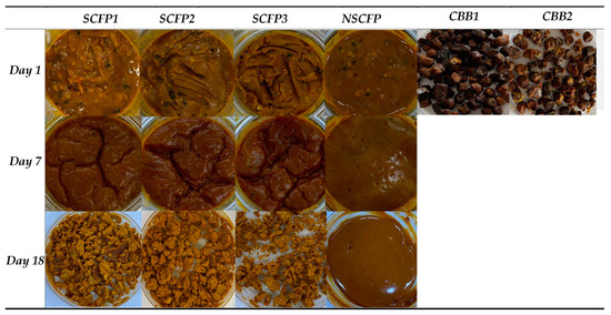 Visualization of pollen fermentation on days 1, 7 and 18. SCFP1: Starter-culture-fermented pollen-1; SCFP2: Starter-culture-fermented pollen-2; SCFP3: Starter-culture-fermented pollen-3; NSCFP: Spontaneously fermented pollen; CBB1: Commercial bee bread (bee bread derived from local market); CBB2: Commercial bee bread-2 (bee bread derived from local producers).