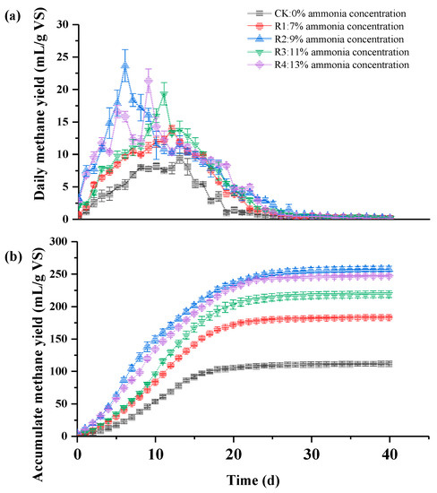 As observed in Figure 1a, the daily methane yield of the pretreatment reactors all showed a fluctuating pattern, beginning with a slow increase and then stabilizing. The differences between the daily methane yield of each reactor were not significant during days 1–2, probably because the easily degradable biomass in the substrate started to degrade gradually at this stage. The methane content increased significantly from day 3 to day 6, with all the different pretreatment reactors showing an advanced peak in daily gas production. Peak methane production rates were 1.47–2.52-fold higher in the pretreated reactors compared to those in the untreated reactors, and daily methane production was significantly higher in the case of 9% ammonia autoclave pretreatment, peaking at day 6 (23.65 mL/gVS). In contrast, daily methane production from the untreated reactor peaked at 9.38 mL/gVS on day 13. This suggested that there may be a mutual synergy between the ammonia–autoclave pretreatment methods, with the combined pretreatment affording easier hydrolyzation and being more successful in improving the biogas production performance of the AD. This may be attributed to the pretreatment altering the microstructure of the corn straw, thereby increasing the accessibility of the enzyme to the straw. The increased lignin removal after pretreatment resulted in significant degradation of exposed cellulose and hemicellulose into small-molecule organic matter by microorganisms and accelerated AD hydrolysis, resulting in an earlier peak in biogas production [14,27]. This result was similar to that obtained in previous research [28].