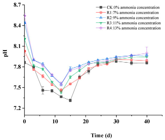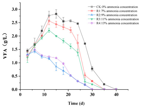 VFAs are an important factor affecting the degradation efficiency and stability of anaerobic fermentation, both as a product of the hydrolysis and acidification stages of AD, and as a substrate used in the methanogenic stage [34,35]. The accumulation of VFAs is generally considered to reduce the pH of the fermentation system, which is detrimental to the growth and reproduction of methanogens, inhibiting methanogenic function and ultimately leading to a decrease in biogas production [36]. The variation in the concentration of VFAs during the AD of each reactor was shown in Figure 2. In the initial stage of AD, VFAs accumulated rapidly in the untreated group, reached a maximum value of 2.83 g/L on day 15, and then began to degrade slowly until reaching complete degradation on day 40. This may be due to the acidification of the untreated corn straw in the early stages of AD, which hindered the growth and proliferation of methanogens, and was also illustrated by the change in methane production. In all pretreatment systems, VFA accumulation was lower compared to that of the control group, demonstrating that the VFAs produced by the pretreatment of corn straw were more readily converted to biogas by the microorganisms, accelerating the utilization of substrate and facilitating the fermentation process. This may be inferred from the increased activity of hydrolytic enzymes as a result of pretreatment, such as cellulase. The pretreated reactors with 9% and 13% ammonia showed a faster degradation of organic acid content, reaching a maximum of 1.43 g/L on day 6 and ending on day 30, indicating that the organic matter after pretreatment was degraded more completely, probably because pretreatment enhanced the hydrolysis rate of the feedstock and alleviated organic acid accumulation. The high VFA concentration inhibited the metabolic activity of methanogens, resulting in a reduction in methane production and in the buffering capacity of the reactor [26,37]. This also explained the higher biogas production in the pretreatment reactor.