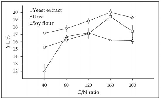3.2. Optimization of Bench Scale Bioconversion with Three Nitrogen Sources and Five C/N Ratios