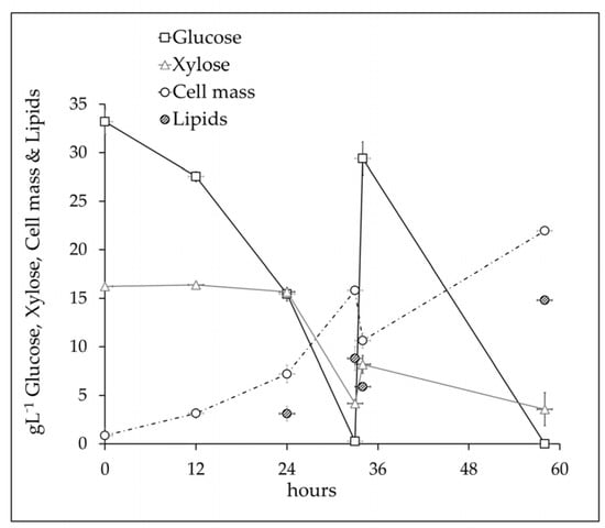 - Xavier, M.C.A.; Coradini, A.L.V.; Deckmann, A.C.; Franco, T.T. Lipid Production from Hemicellulose Hydrolysate and Acetic Acid by Lipomyces starkeyi and the Ability of Yeast to Metabolize Inhibitors. Biochem. Eng. J. 2017, 118, 11–19. [Google Scholar] [CrossRef]
