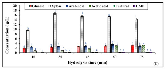Optimization of RS hydrolysis by varying different (A) reagents, (B) sulfuric acid concentrations (0.5 to 2.0%), and (C) residence times of rice straw hydrolysis by 1.25% sulfuric acid (15 to 75 min). Significant differences were calculated by two-way ANOVA using Bonferroni post-tests and are indicated by small letters. At different hydrolysis conditions, the bars with different lowercase letters represent significant differences. Bars with the same letters are not significantly different, according to p < 0.0001.