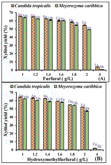 Effect of inhibitory compounds (A) furfural, (B) hydroxymethylfurfural (HMF) on xylitol fermentation efficiency of C. tropicalis and M. caribbica in rice straw hydrolysate. Significant differences were calculated by two-way ANOVA using Bonferroni post-tests and are indicated by small and capital letters. In different concentrations of furfural and HMF, bars with different uppercase letters are significantly different, while bars with lowercase letters represent a significant difference in xylitol production by the two yeasts. Different letters denote a significant difference between the two, and the same letters on the bar denote no significant difference between the two at p < 0.0001.