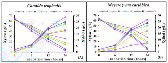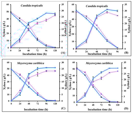 Among different microorganisms, yeasts such as Candida and Debaromyces are regarded as efficient xylitol producers, due to their high xylose assimilation rates and xylitol productivity [10]. Candida tropicalis has been an extensively investigated yeast for xylitol production due to its ability to utilize pentoses, high tolerance to inhibitors, and propensity to thrive in all kinds of biomass-derived hemicellulosic hydrolysates [1,2,3,4,5,11]. Moreover, Meyerozyma caribbica, a mesophilic yeast that is part of the same family as Candida, i.e., Debaromycetaceae, is gaining popularity in biorefineries, due to its capability to utilize a variety of carbon sources from lignocellulosic biomass [12,13]. According to recent studies, it is reported to be an efficient pentose-fermenting yeast, with xylitol as the main product of pentose metabolism [14,15].