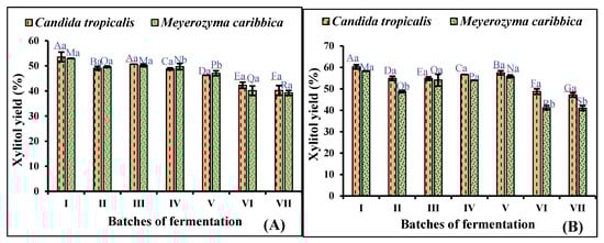 Repeated batch fermentation of adapted strains of C. tropicalis and M. caribbica in (A) non-detoxified rice straw hydrolysate, and (B) detoxified rice straw hydrolysate. Significant differences were calculated by two-way ANOVA using Bonferroni post-tests and are indicated by small and capital letters. In different batches, bars with different uppercase letters are significantly different, while bars with different lowercase letters represent significant differences in xylitol production by the two yeasts. Different letters denote significant difference between the two, and the same letter on the bar denotes no significant difference between the two at p < 0.0001.