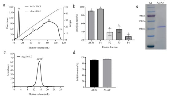 Purification and in vitro antitumor activities of ACPs: (a) Anion exchange chromatography; (b) in vitro antitumor activities of various fractions (F1–F4: fractions 1–4); (c) gel filtration chromatography; (d) in vitro antitumor activities of ACPs and ACAP; (e) SDS-PAGE assay of ACAP (M: Standard markers). The concentration of each fraction in (b,d) was 50 µg/mL. Differing letters above bars indicate significant (p < 0.05) differences according to Tukey’s multiple comparisons test.