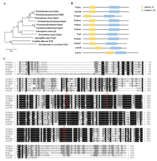 Sequence and phylogenetic analysis of T. reesei Spt1 and its homologs in fungi. (A) Phylogenetic tree of Spt1 homologs in various fungal species. The sequence alignments were performed using the Clustal W program, and the phylogenetic tree was constructed using a neighbor-joining tree, with a bootstrap method of 1000 replications, in the MEGA 6 program. The numbers represent bootstrap values. The scale bar denotes 0.01 changes per nucleotide position. (B) Diagram for the domain architecture of Spt1 homologs. These proteins contain an inhibitor I9 domain (yellow box) and a peptidase S8 domain (blue box). (C) Alignment of the amino acid sequence of Spt1 with related fungal sequences. The high-identity regions in the amino acid sequence are indicated with black backgrounds. The red boxes indicate the active sites for the serine protease belonging to the subtilisin family. * indicate that where the active sites for the serine protease are located. The sequence accession numbers are as follows: XP_006967823.1 (Trichoderma reesei Spt1), OTA08635.1 (Trichoderma parareesei Sub8), UKZ55678.1 (Trichoderma virens Spm1), ABI84117.1 (Trichoderma harzianum Spm1), RSL72882.1 (Fusarium floridanum Spm1), RSM13570.1 (Fusarium ambrosium Spm1), XP_965813.3 (Neurospora crassa p2), KAH8844371.1 (Pyricularia oryzae Spm1), XP_001391470 (Aspergillus niger PepC), XP_715244 (Candida albicans PrB) and NP_010854 (Saccharomyces cerevisiae Prb1).