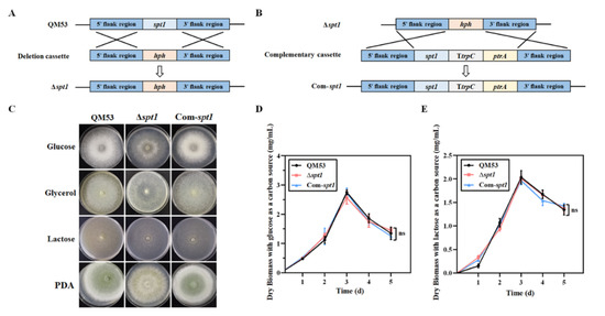 Construction of the spt1 deletion strain Δspt1 and the spt1 complementation strain Com-spt1. (A) Schematic diagram of the spt1 deletion cassette. The cassette was inserted into the endogenous spt1 locus by homologous recombination to knock out the spt1 gene. (B) Schematic diagram of the spt1 complementation cassette. The cassette was inserted into the hph gene locus by homologous recombination to complement the spt1 gene in the Δspt1 strain. (C) Phenotypic analysis of the strains under different carbon sources. The strains were grown on plates containing minimal medium supplemented with 2% glucose, 2% glycerol, 2% lactose or PDA at 30 °C for 3 days. (D) The fungal growth curves of the strains, using 2.0% glucose as the carbon sources. (E) The fungal growth curves of the strains, using 2.0% lactose as the carbon sources. The values represent the mean of three repeated measurements taken from at least three parallel experiments. The error bars refer to the standard deviations (SD). The difference between the parental strain and the recombinant strains was shown by the analysis of ANOVA followed by the Turkey test. ns = not significant.