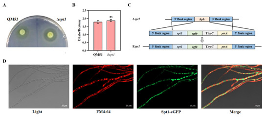 In order to explore the subcellular localization of the Spt1 protein, the co-expression of Spt1-eGFP was observed in fungal mycelia using a laser confocal microscope (LSM900, Carl Zeiss, Jena, Germany). For the staining of vacuole membranes, the mycelia were incubated with 5 μg/mL of membrane-selective red fluorescent dye FM4-64 for 10 min and subjected to analysis. The mycelia for the fluorescence microscopic observation were prepared by the following method: 108 spores of the fluorescently labeled strain were inoculated on GMM plates and cultured at 30 °C for 24 h. The coverslips were inserted diagonally in the plates at an appropriate distance from the spores, and the mycelia grown on the coverslips were directly observed at the end of the culture.