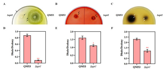 The detection of the cellulase secretion capacity of the spt1 deletion strain Δspt1 using the plates. (A) Qualitative analysis of the cellobiohydrolase (CBH) activity using the plate containing MCC (0.5%). The halo size around the fungal colony after 5 days of growth reflected the ability of the strains to produce cellobiohydrolase (CBH). (B) Qualitative analysis of the endoglucanase (EG) activity using the plate containing CMC-Na (1.0%). The plate was stained with 0.1% Congo red before the hydrolytic haloes were observed. The halo size around the fungal colony after 3 days of growth reflected the extent of the CMC-Na hydrolysis due to the endoglucanase (EG) production. (C) Qualitative analysis of the β-glucosidase (BGL) activity using the plate containing esculin (0.3%). The size of black area around the fungal colony after 24 h of growth indicated the ability of the strains to secrete β-glucosidase (BGL). (D) The cellobiohydrolase (CBH) activity was evaluated by quantifying the ratios of the hydrolytic halo to the colony diameter on the Avicel plate, as shown in (A). (E) The endoglucanase (EG) activity was evaluated by quantifying the ratios of the hydrolytic halo to the colony diameter on the CMC-Na plate, as shown in (B). (F) The β-glucosidase (BGL) activity was evaluated by quantifying the ratios of the black area to the colony diameter on the CMC-esculin plate, as shown in (C). The boundaries of the halos and the colonies are indicated by black or white arrows on the plates. The values represent the average of three repeated measurements obtained from three different angles. The error bars refer to the standard deviations (SD). The difference between the parental strain and the deletion strain was shown by the analysis of ANOVA, followed by the Turkey test. * p < 0.05; ** p < 0.01.