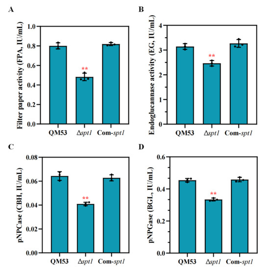 A comparison of cellulase production in T. reesei Δspt1, Com-spt1 and the parental strain QM53 during liquid fermentation, using MCC as the carbon source. The filter paper activity (A), the endoglucanase (EG) activity (B), the cellobiohydrolase (CBH) activity (C) and the β-glucosidase (BGL) activity (D) were determined in the fermentation broth on the 7th day. The strains were cultured in cellulase-inducing medium containing MCC as the carbon source at 30 °C for 7 days. The values represent the mean of three repeated measurements taken from at least three parallel experiments. The error bars refer to the standard deviations (SD). The difference between the parental strain and the recombinant strains was shown by the analysis of ANOVA, followed by the Turkey test. ** p < 0.01.