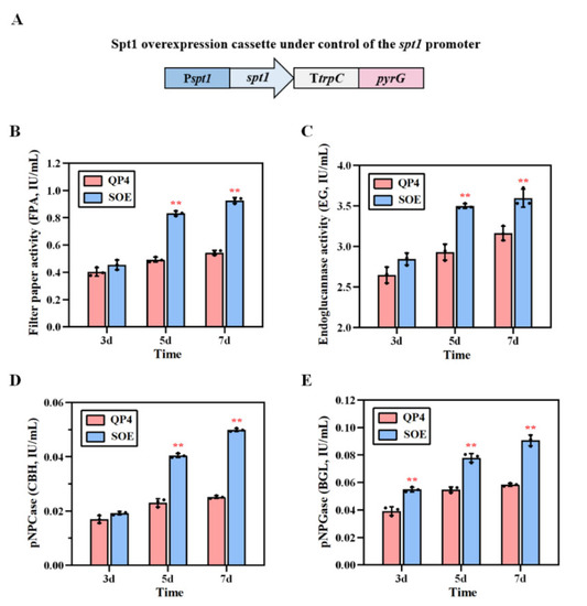 Cellulase production by the strain SOE, using the native promoter Pspt1 to drive spt1 overexpression. (A) Schematic diagram of the spt1 gene overexpression cassette (6.0 kb) under the control of the native promoter Pspt1. The cassette would be inserted into the genome of T. reesei with multiple copies by random integration. The filter paper activity (B), the endoglucanase (EG) activity (C), the cellobiohydrolase (CBH) activity (D) and the β-glucosidase (BGL) activity (E) were measured at 3 d, 5 d, and 7 d of cellulase-inducing cultivation. The strains were cultured in cellulase-inducing medium containing MCC as the carbon source at 30 °C for 7 days. The values represent the mean of three repeated measurements taken from at least three parallel experiments. The error bars refer to the standard deviations (SD). The difference between the parental strain and the overexpression strain was shown by the analysis of ANOVA, followed by the Turkey test. ** p < 0.01.