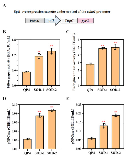 Cellulase production by the strains SOD-1 and SOD-2, using the strong constitutive promoter Pcdna1 to drive spt1 overexpression. (A) Schematic diagram of the spt1 gene overexpression cassette (6.0 kb) under the control of the strong constitutive promoter Pcdna1. The cassette would be inserted into the genome of T. reesei with multiple copies by random integration. The filter paper activity (B), the endoglucanase (EG) activity (C), the cellobiohydrolase (CBH) activity (D) and the β-glucosidase (BGL) activity (E) of the culture supernatant from the spt1 overexpression strains (SOD-1, SOD-2) and the parental strain QM53 were measured on the 7th day of fermentation. The strains were cultured in cellulase-inducing medium containing MCC as the carbon source at 30 °C for 7 days. The values represent the mean of three repeated measurements taken from at least three parallel experiments. The error bars refer to the standard deviations (SD). The difference between the parental strain and the overexpression strains was shown by the analysis of ANOVA, followed by the Turkey test. ** p < 0.01.