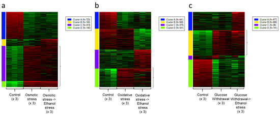 K-means clustering analysis of FPKM data after different sequential stresses. (a) Gene clusters after osmotic stress followed by ethanol stress. (b) Gene clusters after oxidative stress followed by ethanol stress. (c) Gene clusters after glucose withdrawal followed by ethanol stress. For each treatment, four clusters were identified and are color-coded in blue, yellow, purple, and green. The cluster with the gene pattern of interest was highlighted in each treatment. The analysis included the 2000 most variable genes and was mean-normalized. Values below the mean are shown in green, and those above are shown in red. The number of replicates analyzed from each treatment is identified in parentheses.