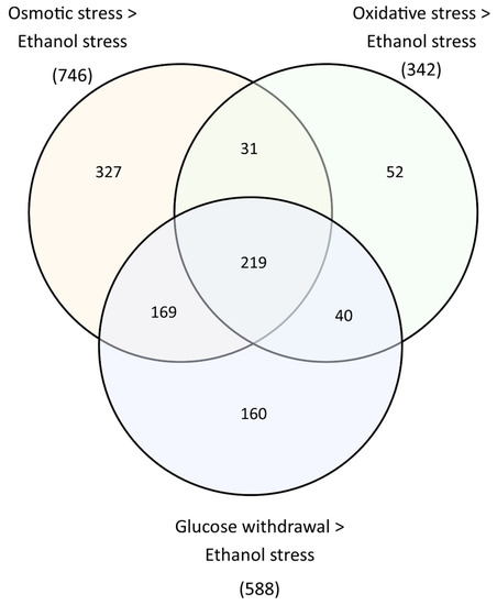 A few studies have explored the effects of multiple and sequential stresses and have shown that yeast subjected to different mild stresses followed by lethal stress exhibit little overlap in the genes involved in the response [10]. Further analyses of yeast cellular memory in response to short, pulsed hyperosmotic stress also demonstrated diverse gene behavior [11]. However, a comprehensive evaluation of the common response to sequential stresses that considers the conditions of industrial environments, focusing on genes induced in all stresses, remains to be thoroughly explored, particularly in yeast strains that already possess a multi-tolerant profile.