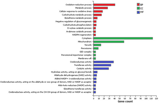 The 10 most significant terms annotated in all three Gene Ontology (GO) categories are listed in Figure 3. The biological processes included oxidation–reduction (41 genes), metabolism (27 genes), cellular response to oxidative stress (17 genes), carbohydrate metabolism (15 genes), glutathione metabolism (7 genes), negative regulation of gluconeogenesis (5 genes), carbohydrate phosphorylation (5 genes), D-xylose catabolism (4 genes), arabinose catabolism (4 genes), and NADPH regeneration (4 genes). The enriched processes indicate diverse cellular activities, especially those involved in catabolism and defense against oxidative stress. The cellular components included the cytoplasm (113 genes), mitochondria (58 genes), vacuole (14 genes), peroxisome (9 genes), glucose-induced degradation (GID) complex (4 genes), peroxisomal importomer complex (4 genes), and membrane raft (4 genes). Regarding molecular functions, genes were involved in oxidoreductase activity (38 genes); transferase activity (33 genes); catalytic activity (29 genes); hydrolase activity, acting on glycosyl bonds (7 genes); aldehyde dehydrogenase (NAD) activity (6 genes); alditol: NADP+ 1-oxidoreductase activity (5 genes); oxidoreductase activity, acting on the aldehyde or oxo group of donors, NAD, or NADP as acceptor (5 genes); aldo–keto reductase (NADP) activity (4 genes); glutathione transferase activity (4 genes); and oxidoreductase activity, acting on the CH-OH group of donors, NAD, or NADP as acceptor (4 genes). The major molecular function category was oxidoreductase activity, indicating redox-balance-related gene expression alterations under sequential stresses. Molecular functions involving nicotinamide adenine dinucleotide (NAD+), an essential cofactor involved in various cellular processes, were also highlighted.